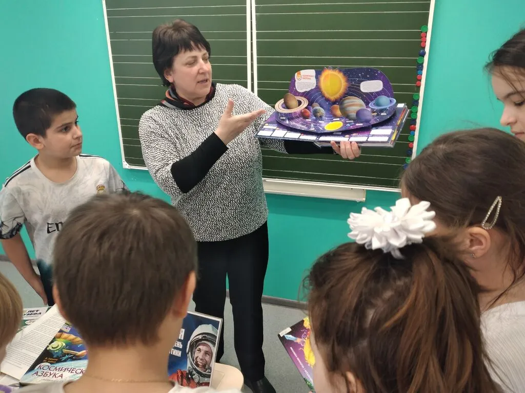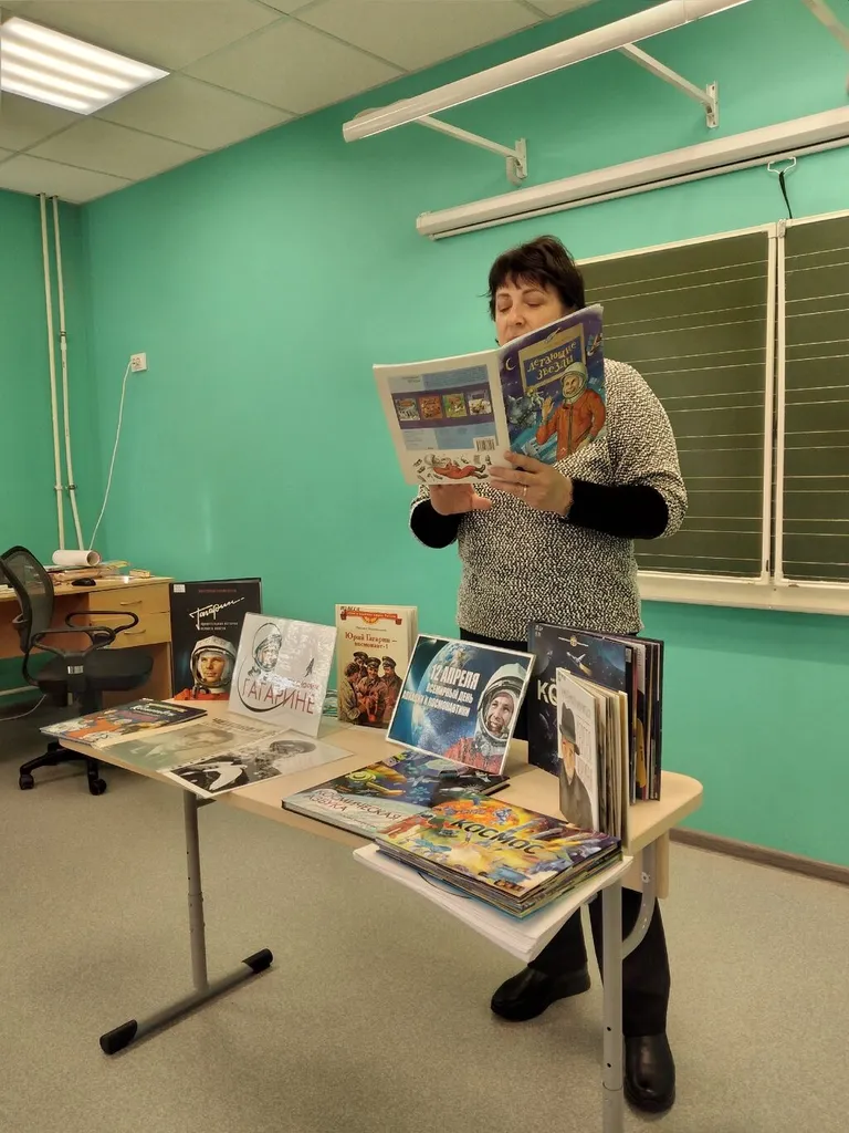 В рамках этой акции наши библиотекари посетили школу п.г.т. Рощинский. Мы прочитали рассказ о детстве Юрия Гагарина, который входит в серию книг В. Воскобойникова «Жизнь замечательных детей». Рассмотрели книгу А. Ткаченко «Летающие звёзды», из которой ребята узнали многие ответы на свои вопросы о космосе: как человеку удалось преодолеть земное притяжение и вырваться в космос, как готовят космонавтов, как устроен скафандр и многие другие.