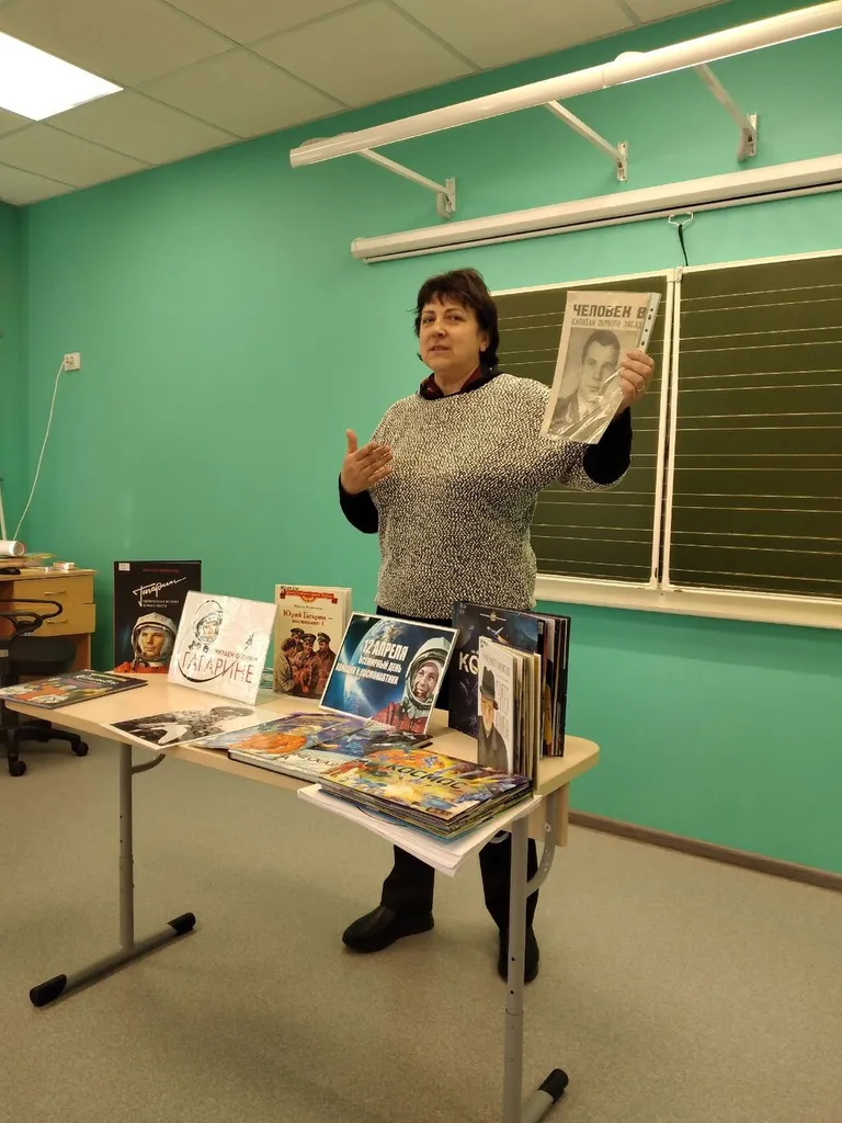 С собой мы привезли небольшую передвижную выставку с книгами о космосе и газетой, выпущенной 13 апреля 1961 года сразу после первого полёта в космос и хранящейся в фонде Детской библиотеки.